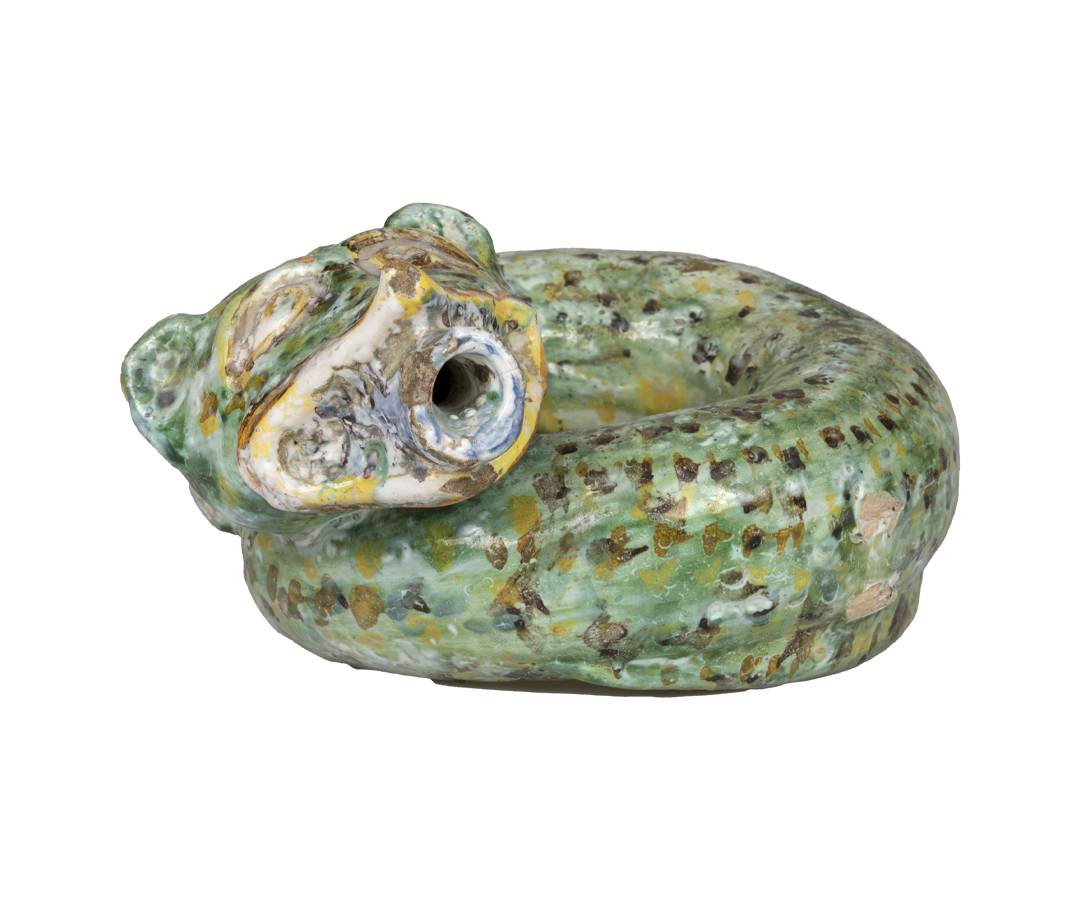Home > Collections > Italian Folk Arts and Traditions > Green painted water bottle with black and yellow handles shaped like a coiled snake with a quadruped head