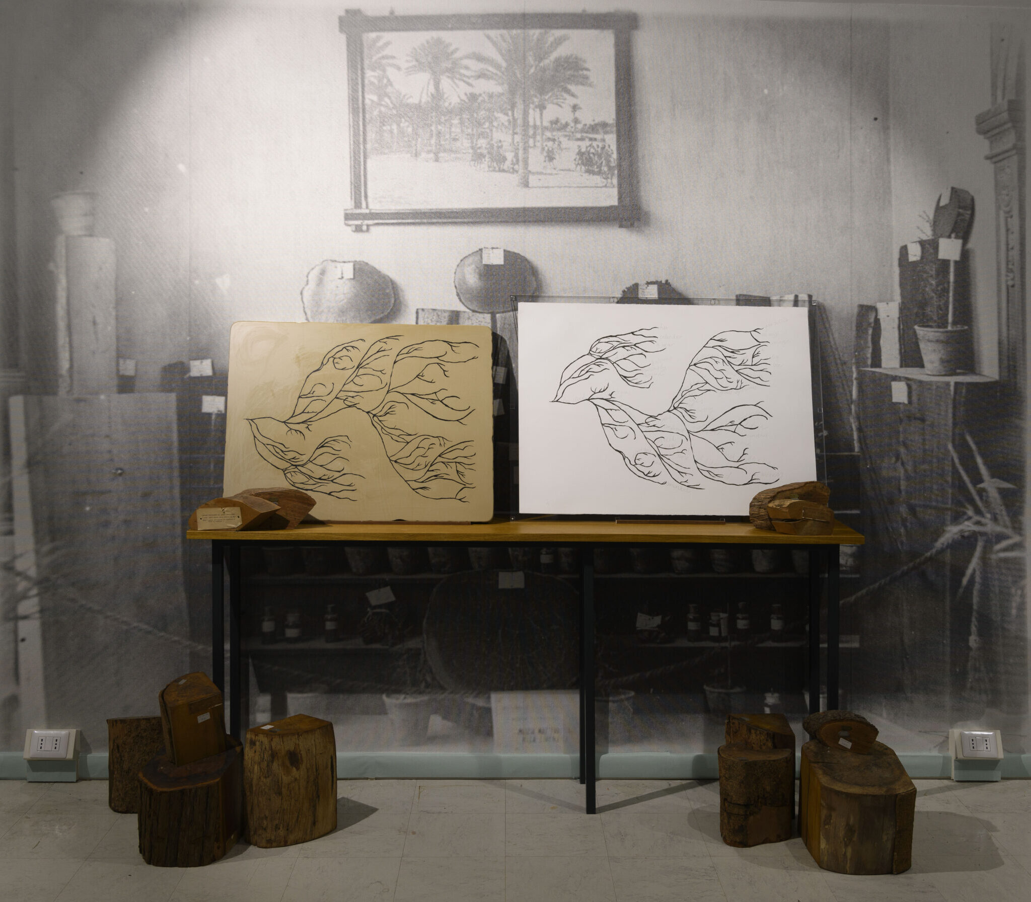 L’installazione rappresenta una formalizzazione temporanea della ricerca in corso che Bianca Baldi (Johannesburg, 1985; vive e lavora a Bruxelles) ha cominciato nell’autunno del 2022 grazie alla borsa di ricerca del progetto Taking Care – Ethnographic and World Cultures Museums as Spaces of Care, co-finanziato dal programma Creative Europe dell’Unione Europea. Il punto di partenza è una collezione privata di fotografie scattate dal nonno paterno dell’artista, soldato ad Addis Abeba durante l’occupazione italiana dell’Etiopia, dove ricorre la presenza di un albero (il ficus sycomorus) che l’artista ritrova ancora intatto nel 2019, in occasione di una sua visita alla città. Nell’attraversare i depositi del Museo delle Civiltà Baldi si è concentrata sulle collezioni merceologiche e in particolare sui campioni lignei, ponendo l’attenzione sulle estrazioni di risorse naturali che servivano all’espansione dell’industria italiana. Sulla carta da parati di fondo, appare una fotografia delle pian- te esposte nella “Mostra permanente prodotti coloniali”, tenutasi negli anni ‘30 presso la Camera di Commercio, Industria e Agricoltura della Cirenaica a Bengasi, sulla quale l’artista prolunga le mensole ritratte ed espone nuovamente alcuni dei campioni originali. Questo intervento dialoga con una stampa litografica nella quale dai rami del sicomoro emergono parole di una poesia che lo fa parlare, grazie ad un altro elemento naturale, ovvero la pietra litografica, anch’essa esposta. Il sicomoro delle foto del nonno diventa quindi un testimone centenario dello sfruttamento coloniale, che permette di sviluppare però una nuova narrazione a partire da una prospettiva più ampia e multi-specie, che intreccia fra loro creature e materie diverse così come passato, presente e futuri possibili. ML